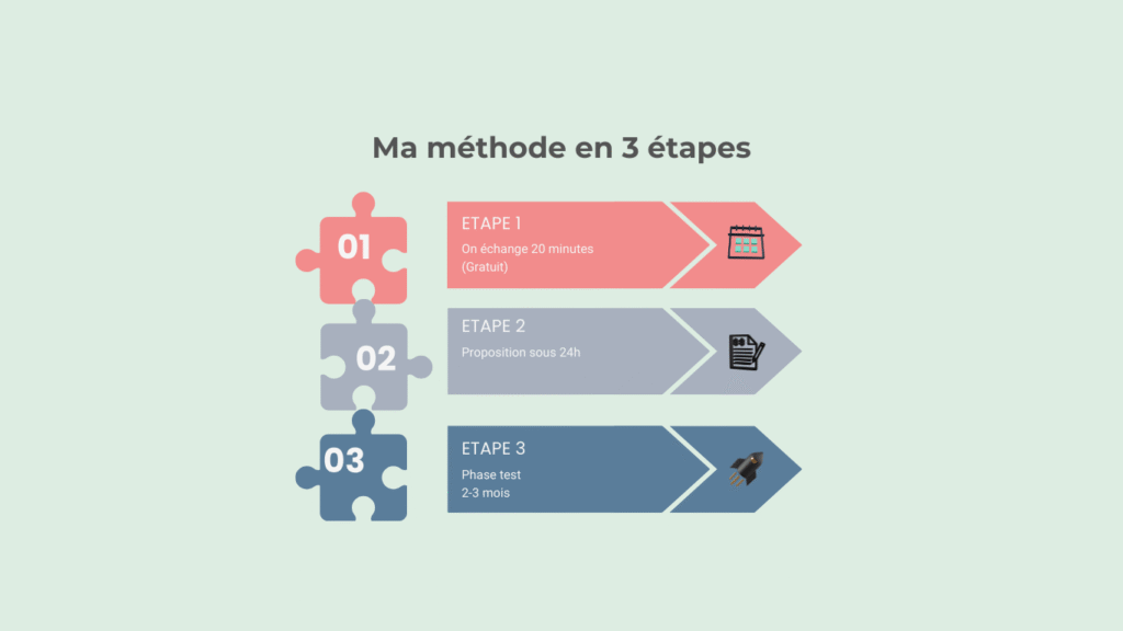 Pas de pack tout fait. Pas d’engagement long terme. On démarre en phase test pour ajuster ensemble selon vos besoins réels.